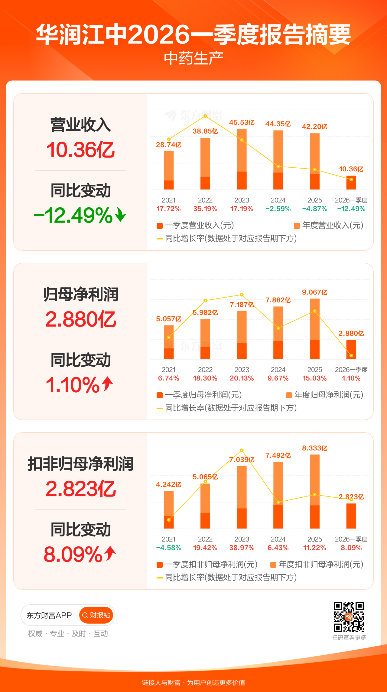 华润江中4月25日发布2026年一季报显示,公司一季度实现营业收入10.36亿元,同比下滑12.49%;归母净利润2.88亿元,同比增长1.10%;扣非归母净利润2.82亿元,同比增长8.09%。