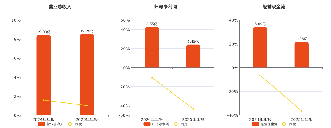 公司营业总收入为19.28亿元。归母净利润为1.45亿元,较去年同报告期归母净利润减少1.11亿元,同比较去年同期下降43.32%。经营活动现金净流入为1.96亿元,较去年同报告期经营活动现金净流入减少1.13亿元,同比较去年同期下降36.51%。