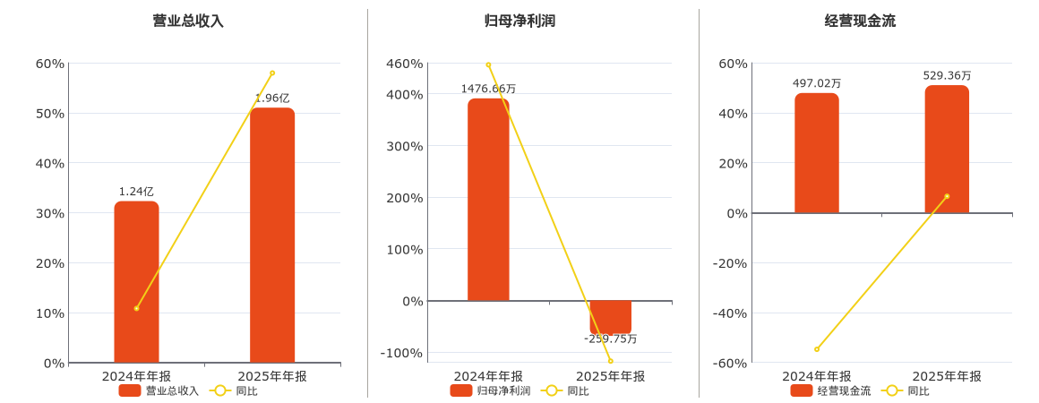 公司营业总收入为1.96亿元,在已披露的同业公司中排名第142。归母净利润为-259.75万元,在已披露的同业公司中排名第124,较去年同报告期归母净利润减少1736.41万元,同比较去年同期下降117.59%。经营活动现金净流入为529.36万元,在已披露的同业公司中排名第129。