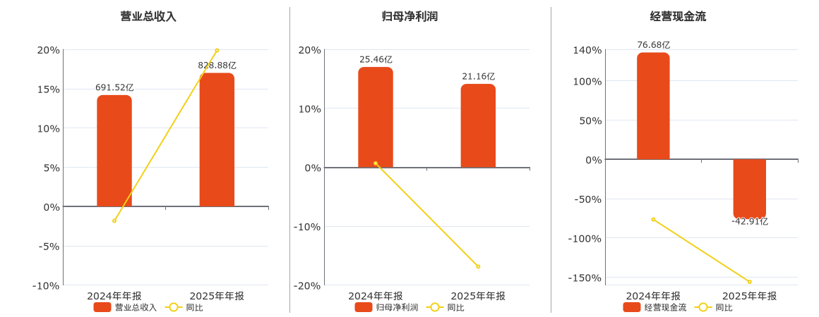 公司营业总收入为828.88亿元。归母净利润为21.16亿元,较去年同报告期归母净利润减少4.29亿元,同比较去年同期下降16.87%。经营活动现金净流入为-42.91亿元,在已披露的同业公司中排名第61,较去年同报告期经营活动现金净流入减少119.59亿元,同比较去年同期下降155.96%。