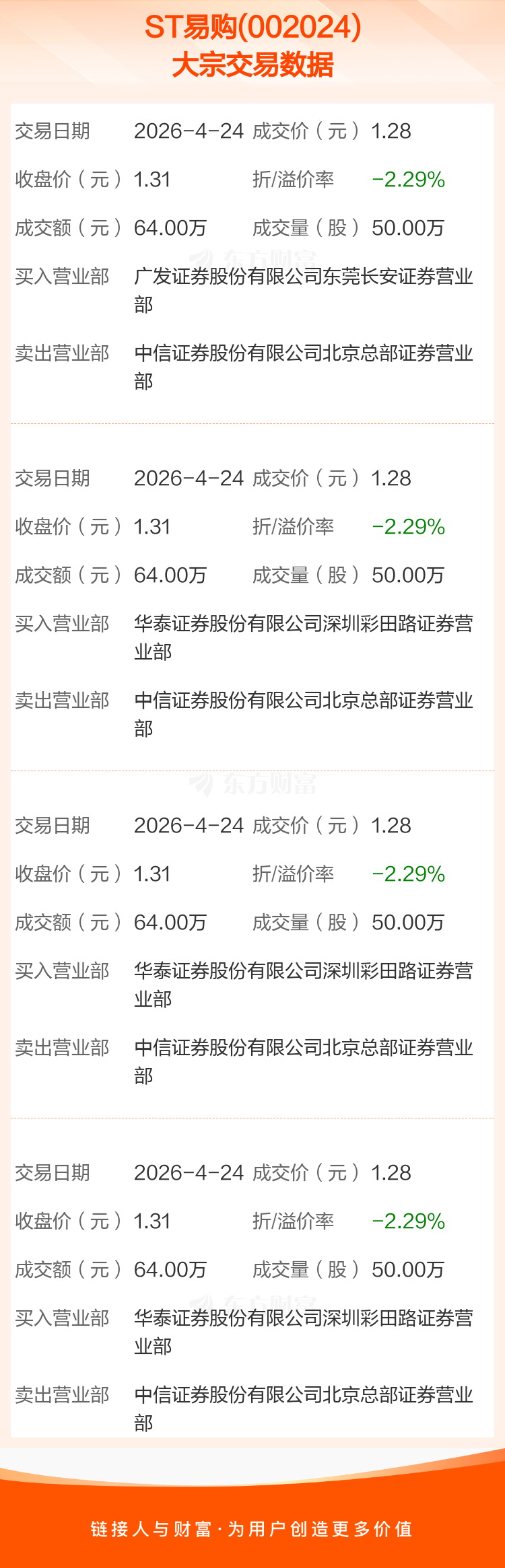 2026年4月24日,ST易购发生4笔大宗交易,共成交200.00万股,成交金额256.00万元,占其流通市值比例为0.02%。