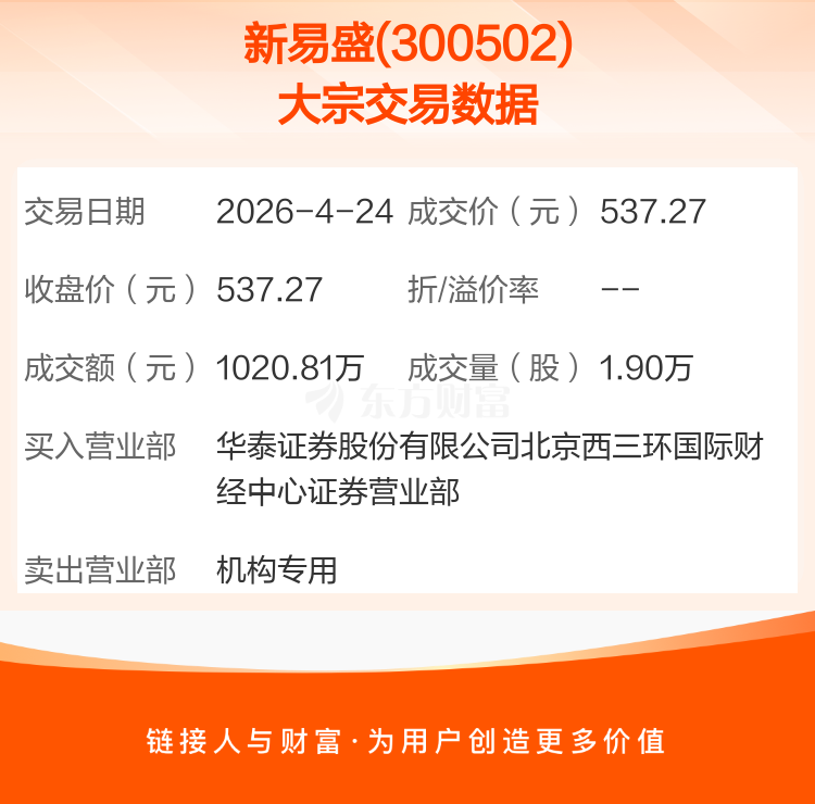 2026年4月24日,新易盛发生1笔大宗交易,共成交1.90万股,成交金额1020.81万元。