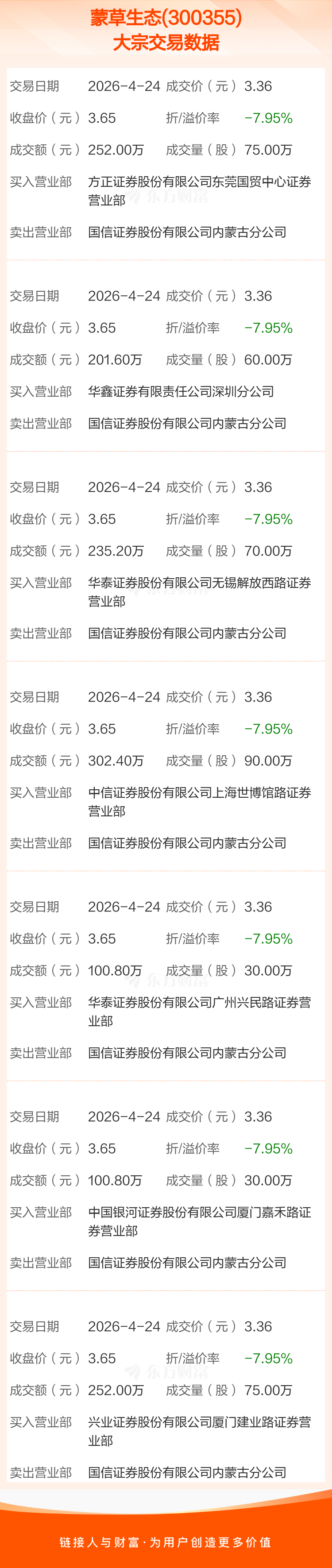 2026年4月24日,蒙草生态发生7笔大宗交易,共成交430.00万股,成交金额1444.80万元,占其流通市值比例为0.29%。