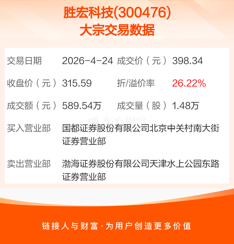 2026年4月24日,胜宏科技发生1笔大宗交易,共成交1.48万股,成交金额589.54万元。