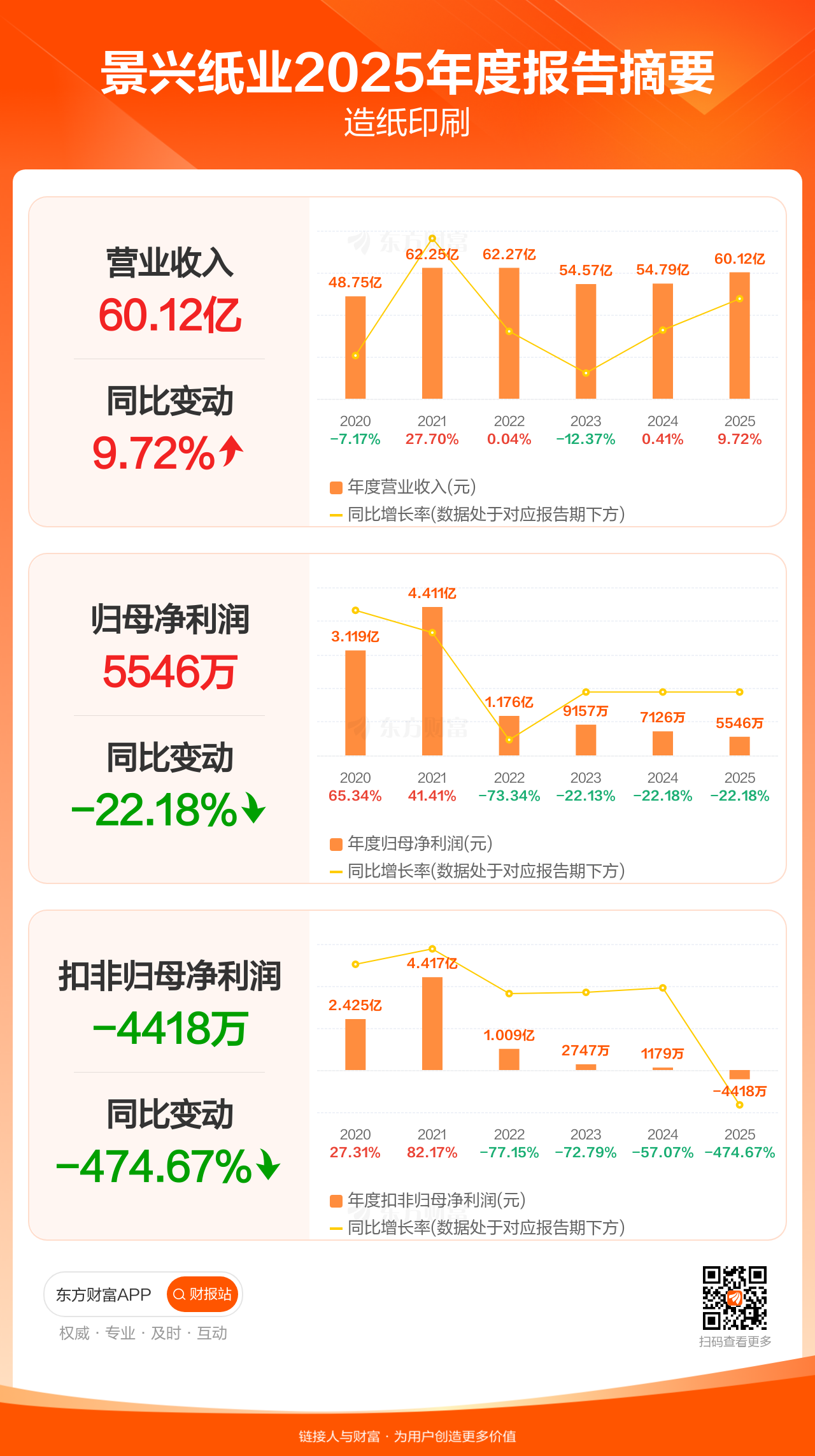 景兴纸业4月25日发布2025年年报显示,公司全年实现营业收入60.12亿元,同比增长9.72%;归母净利润5545.81万元,同比下滑22.18%;扣非归母净利润-4417.99万元。