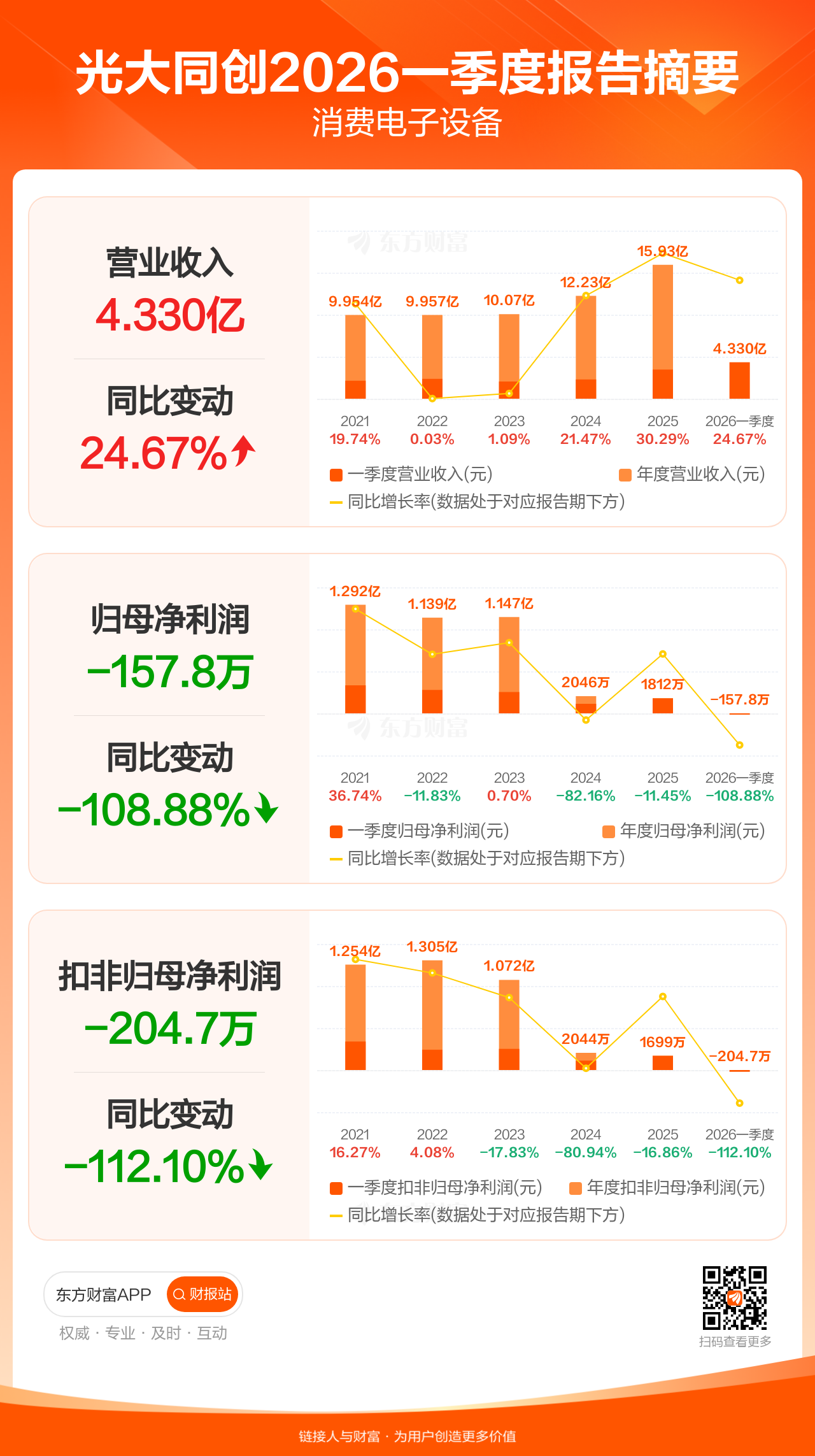 光大同创4月25日发布2026年一季报显示,公司一季度实现营业收入4.33亿元,同比增长24.67%;归母净利润-157.76万元;扣非归母净利润-204.75万元。