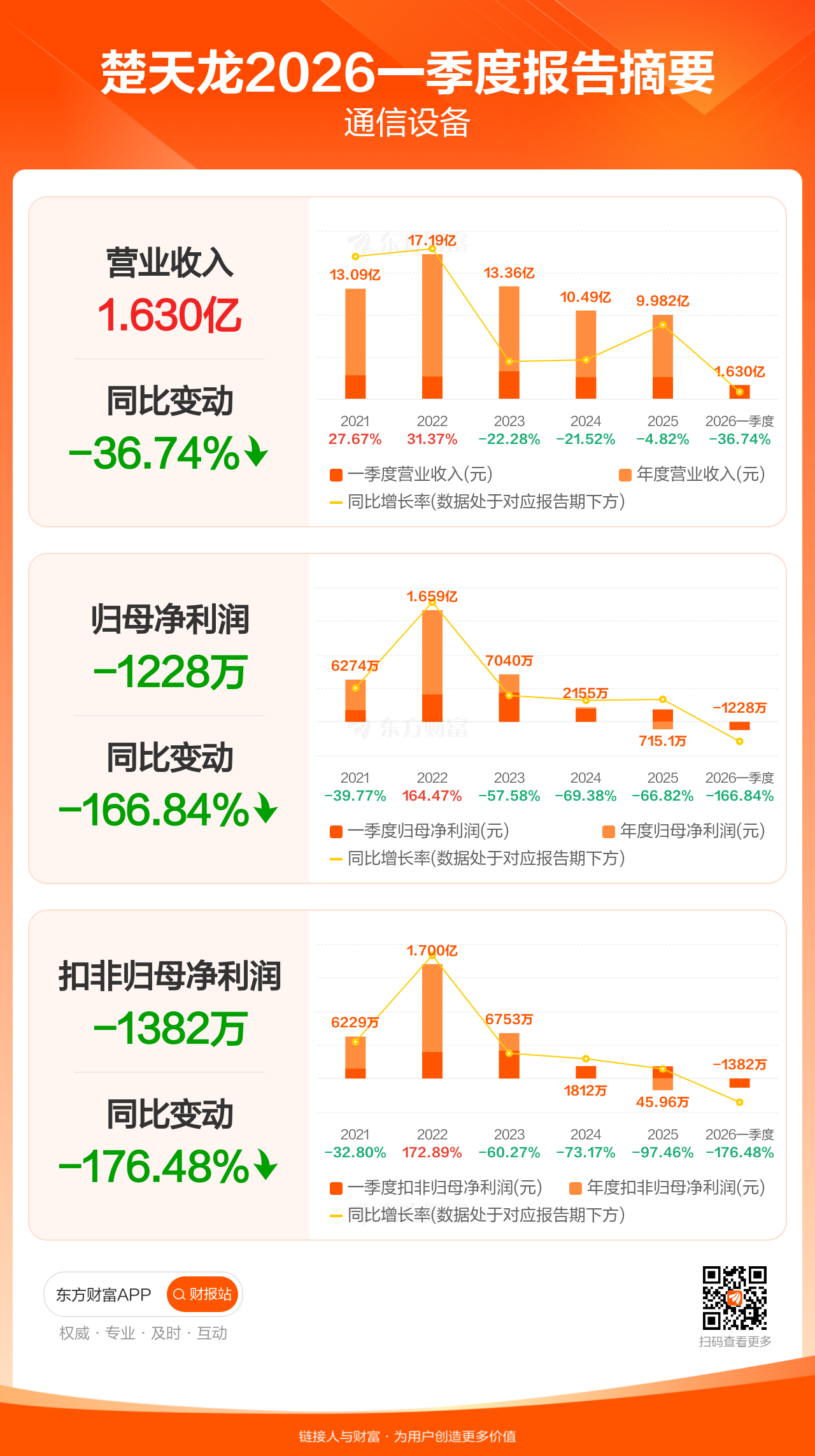 楚天龙4月25日发布2026年一季报显示,公司一季度实现营业收入1.63亿元,同比下滑36.74%;归母净利润-1227.91万元;扣非归母净利润-1381.55万元。