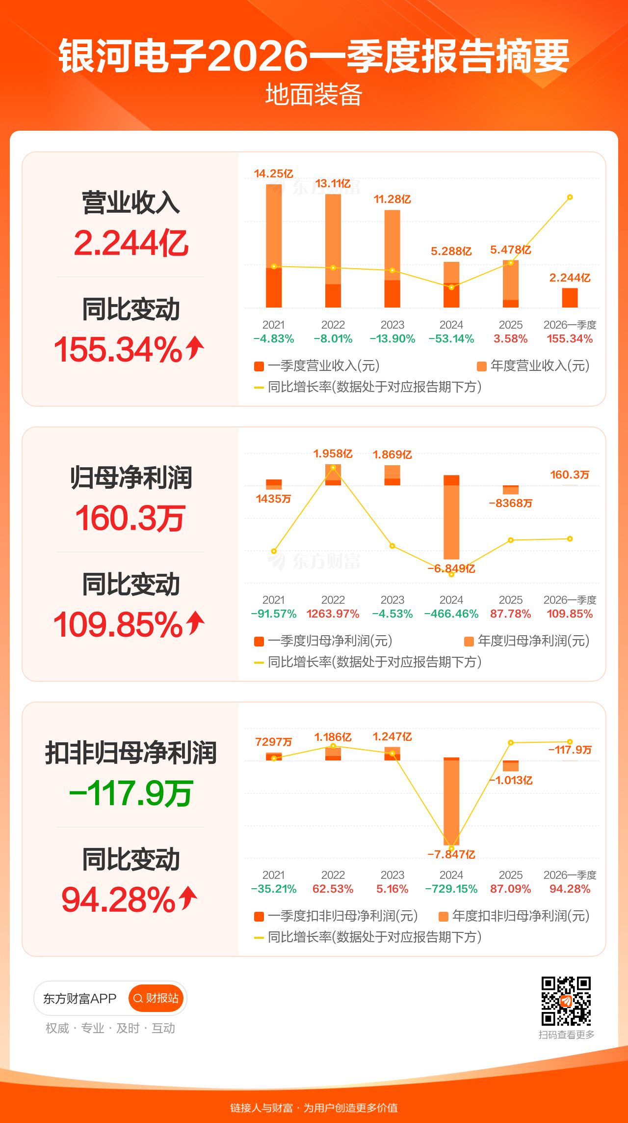 银河电子4月25日发布2026年一季报显示,公司一季度实现营业收入2.24亿元,同比增长155.34%;归母净利润160.34万元,同比增长109.85%;扣非归母净利润-117.89万元。