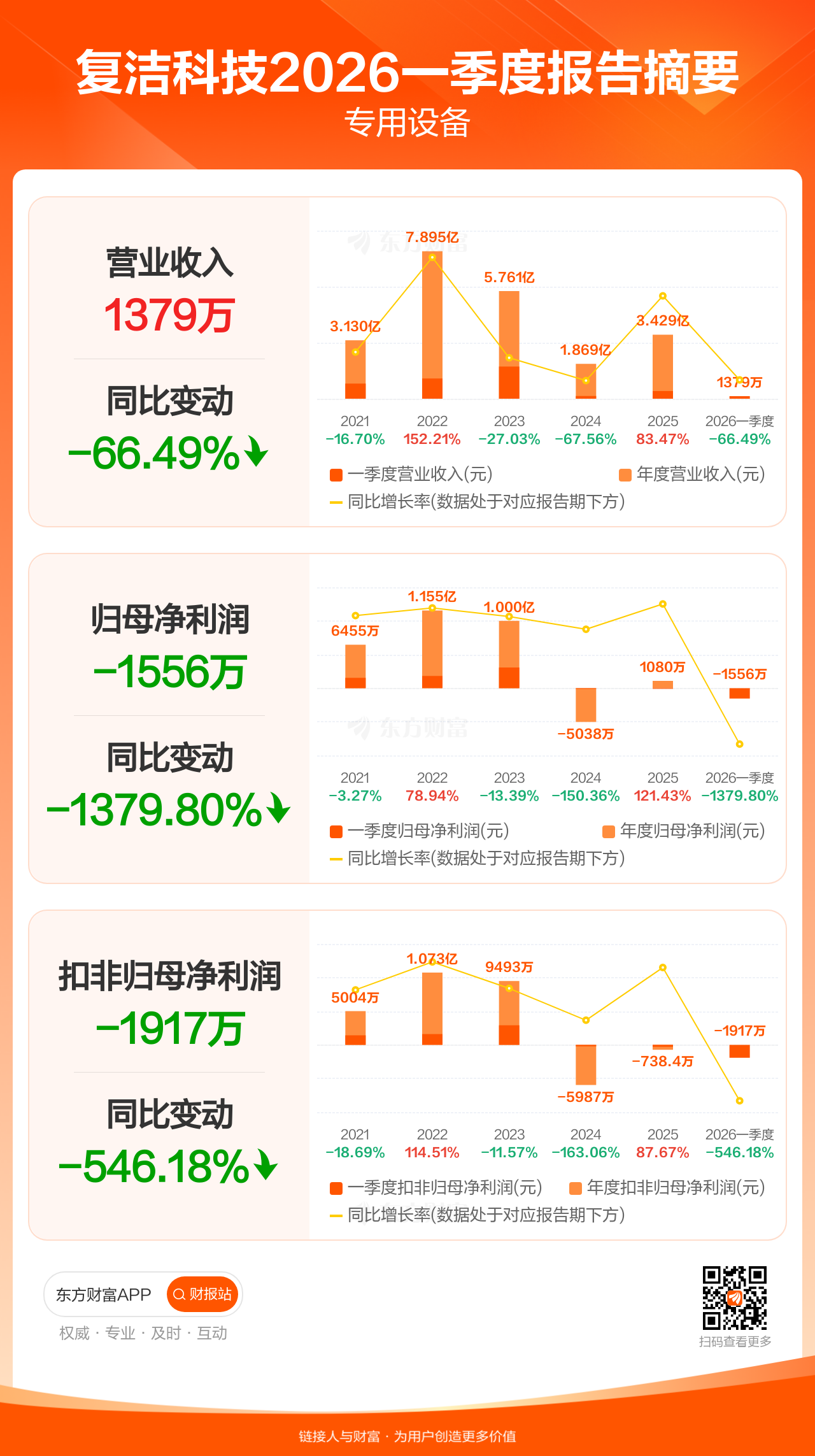 复洁科技4月25日发布2026年一季报显示,公司一季度实现营业收入1378.79万元,同比下滑66.49%;归母净利润-1556.31万元;扣非归母净利润-1917.07万元。