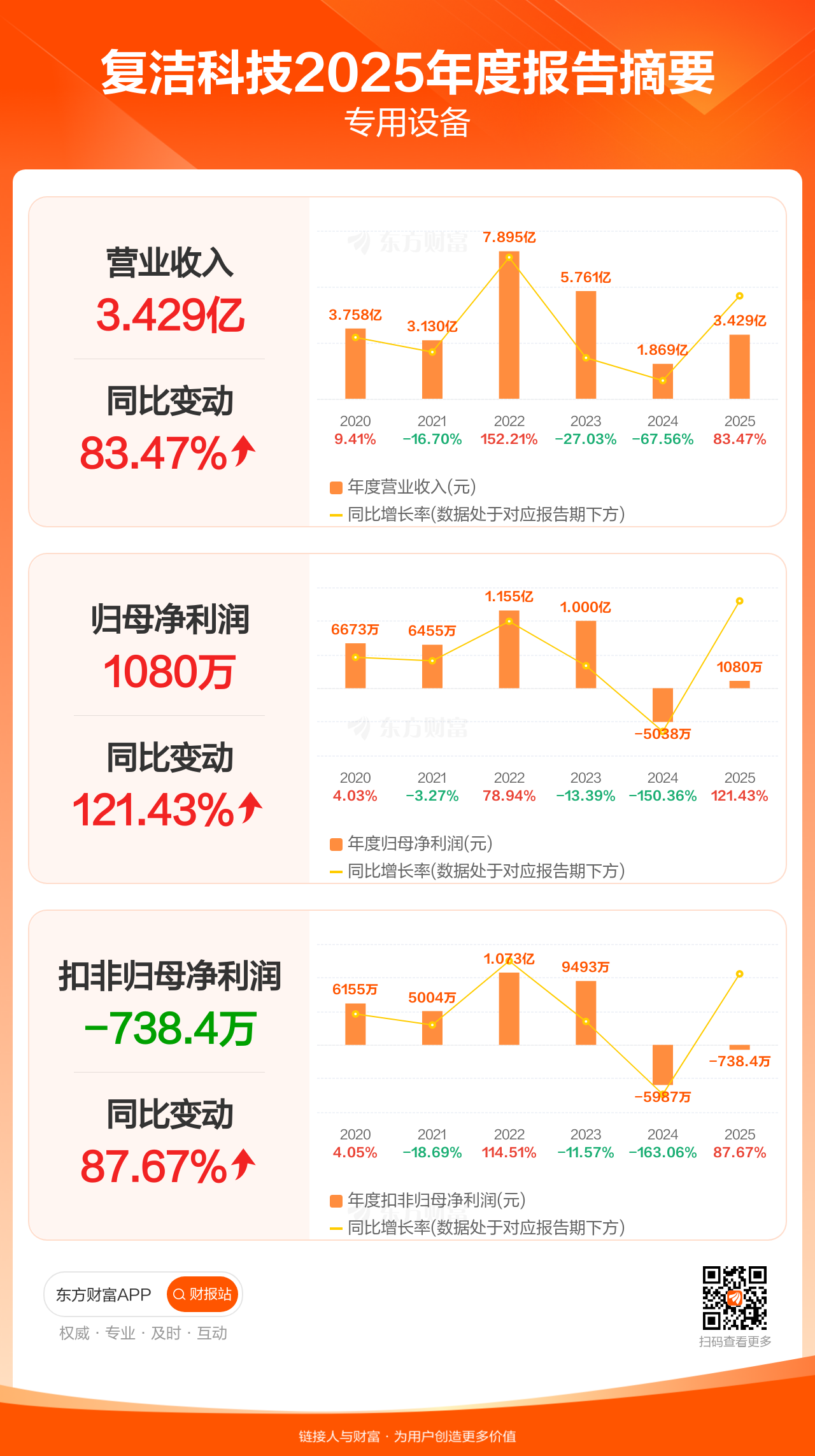 复洁科技4月25日发布2025年年报显示,公司全年实现营业收入3.43亿元,同比增长83.47%;归母净利润1079.59万元,同比增长121.43%;扣非归母净利润-738.35万元。