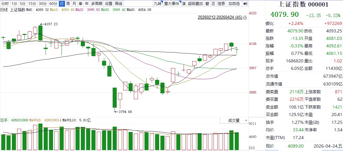 回到大盘,三大股指表现并不尽如人意。在前一交易日冲高回落后,4月24日延续震荡调整格局。总体来看,三大股指均运行在5日、10日均线之间的狭小缝隙中震荡。