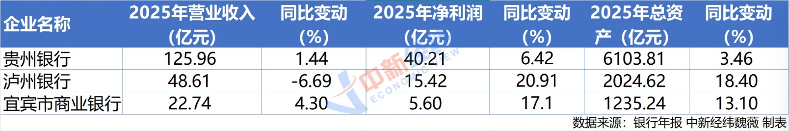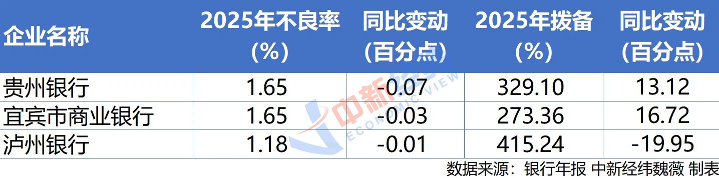 从资产质量来看,截至2025年末,贵州银行、宜宾银行、泸州银行的不良贷款率分别为1.65%、1.65%和1.18%,均较上年末有所下降。