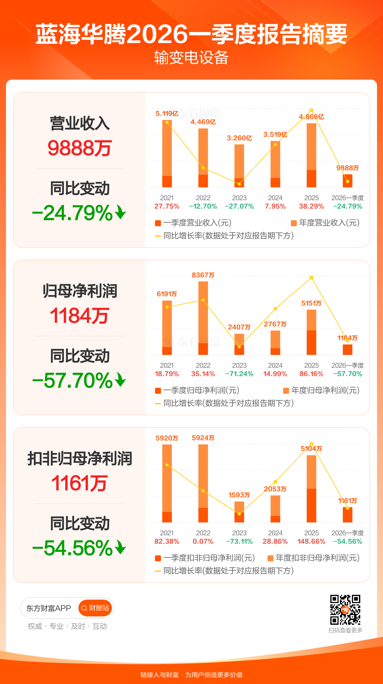 蓝海华腾4月25日发布2026年一季报显示,公司一季度实现营业收入9888.26万元,同比下滑24.79%;归母净利润1184.03万元,同比下滑57.70%;扣非归母净利润1161.00万元,同比下滑54.56%。