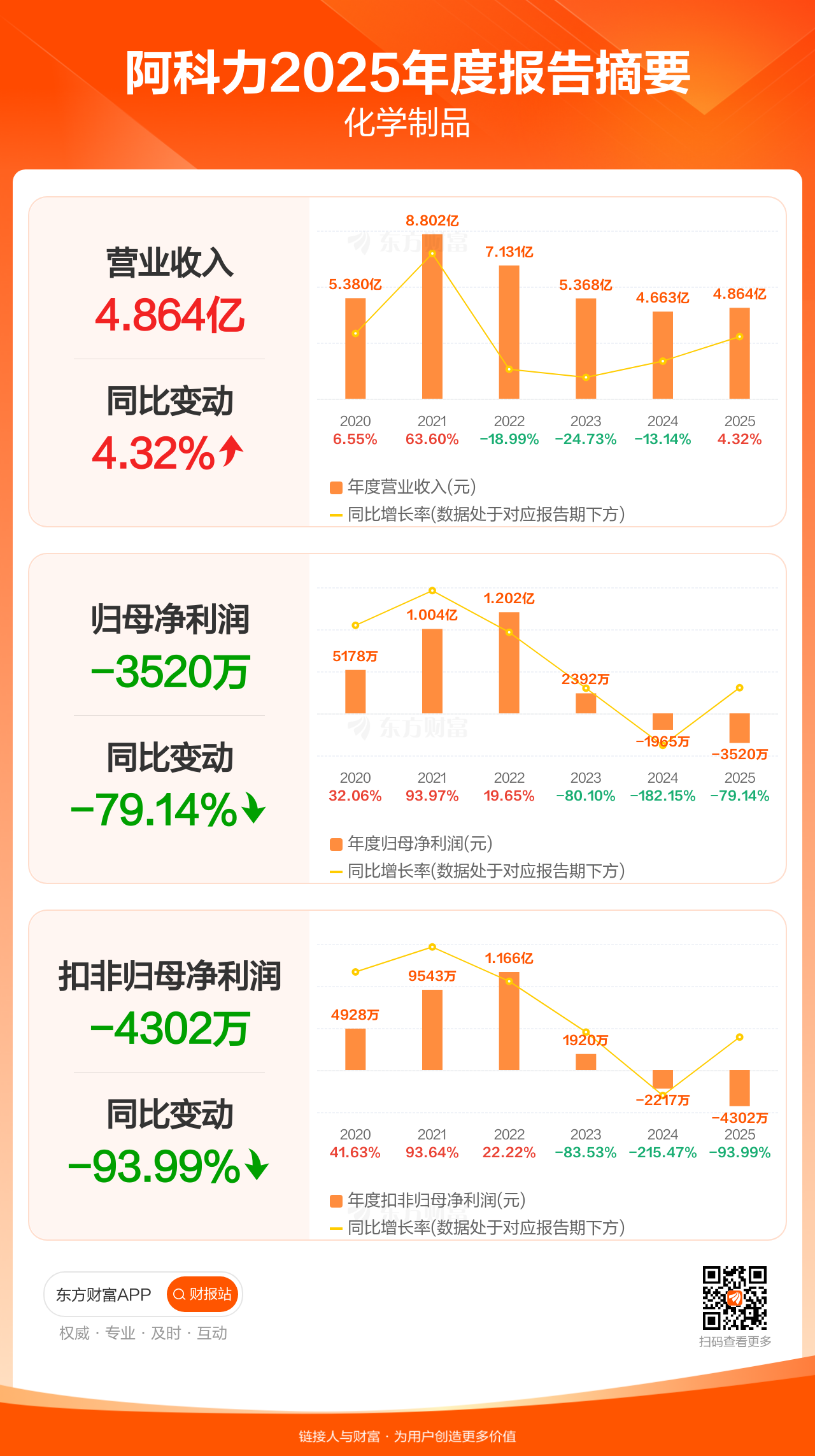 阿科力4月25日发布2025年年报显示,公司全年实现营业收入4.86亿元,同比增长4.32%;归母净利润-3520.24万元;扣非归母净利润-4301.56万元。