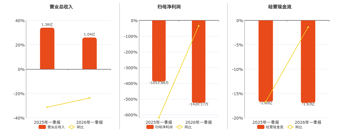 公司营业总收入为1.04亿元,较去年同报告期营业总收入减少3238.81万元,同比较去年同期下降23.74%。归母净利润为-1420.17万元,较去年同报告期归母净利润减少366.30万元。经营活动现金净流入为-1.63亿元,较去年同报告期经营活动现金净流入减少221.66万元。