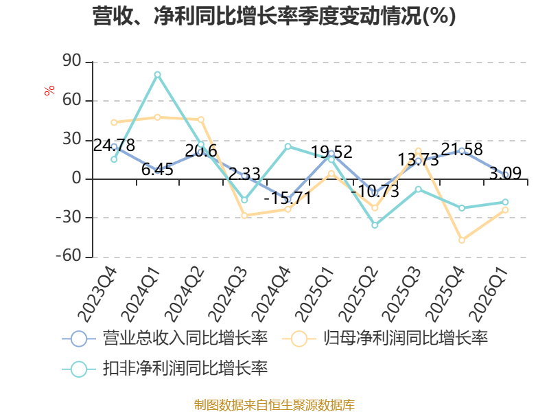 中证智能财讯凯众股份(603037)4月25日披露2026年第一季度报告。公司实现营业总收入1.64亿元,同比增长3.09%;归母净利润952.5万元,同比下降23.94%;扣非净利润997.04万元,同比下降17.85%;经营活动产生的现金流量净额为-2954.71万元,上年同期为2914.86万元;报告期内,凯众股份基本每股收益为0.04元,加权平均净资产收益率为0.92%。