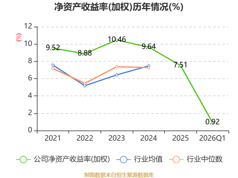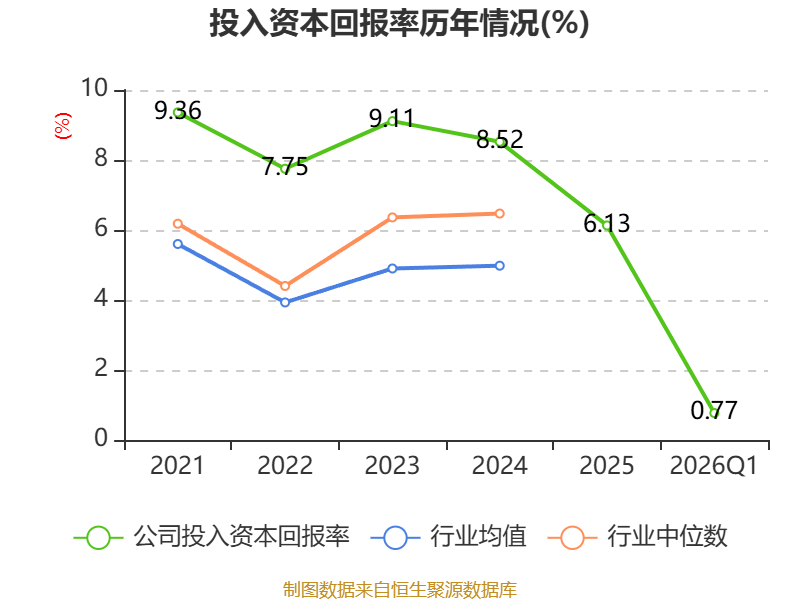 盈利能力方面, 2026年一季度公司加权平均净资产收益率为0.92%,同比下降0.37个百分点。公司2026年第一季度投入资本回报率为0.77%,较上年同期下降0.38个百分点。