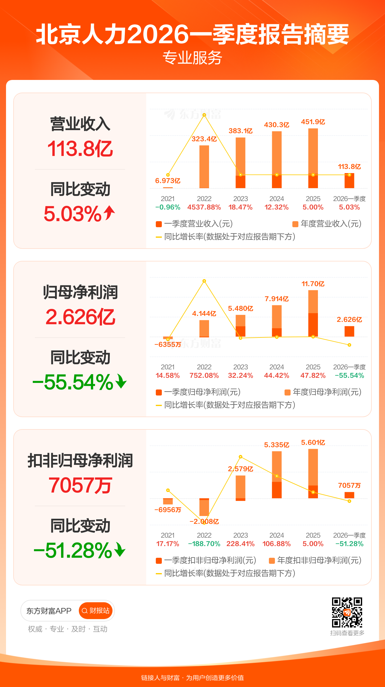 北京人力4月25日发布2026年一季报显示,公司一季度实现营业收入113.82亿元,同比增长5.03%;归母净利润2.63亿元,同比下滑55.54%;扣非归母净利润7057.29万元,同比下滑51.28%。