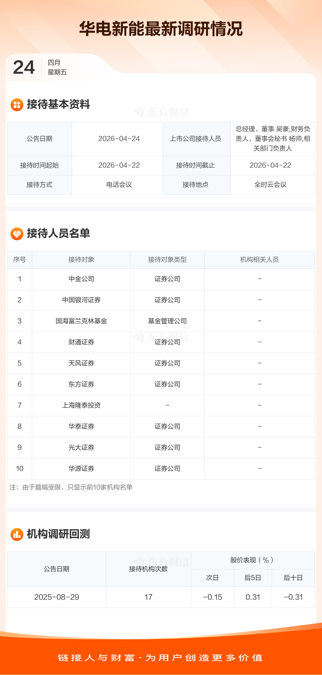 华电新能4月24日公告称,4月22日接待中金公司等15家机构调研。接待人员包括总经理、董事 吴豪,财务负责人、董事会秘书 杨帅,相关部门负责人。