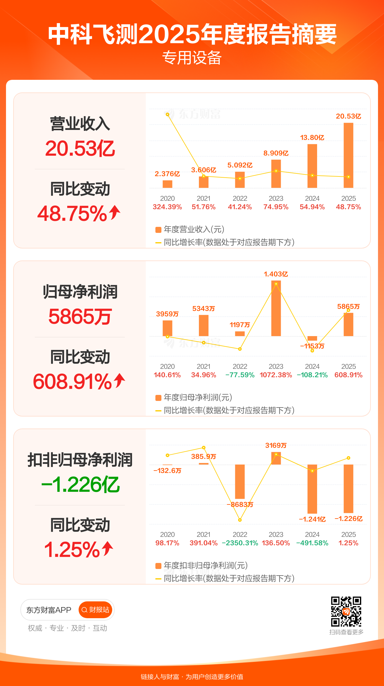 中科飞测4月25日发布2025年年报显示,公司全年实现营业收入20.53亿元,同比增长48.75%;归母净利润5865.26万元,同比增长608.91%;扣非归母净利润-1.23亿元。