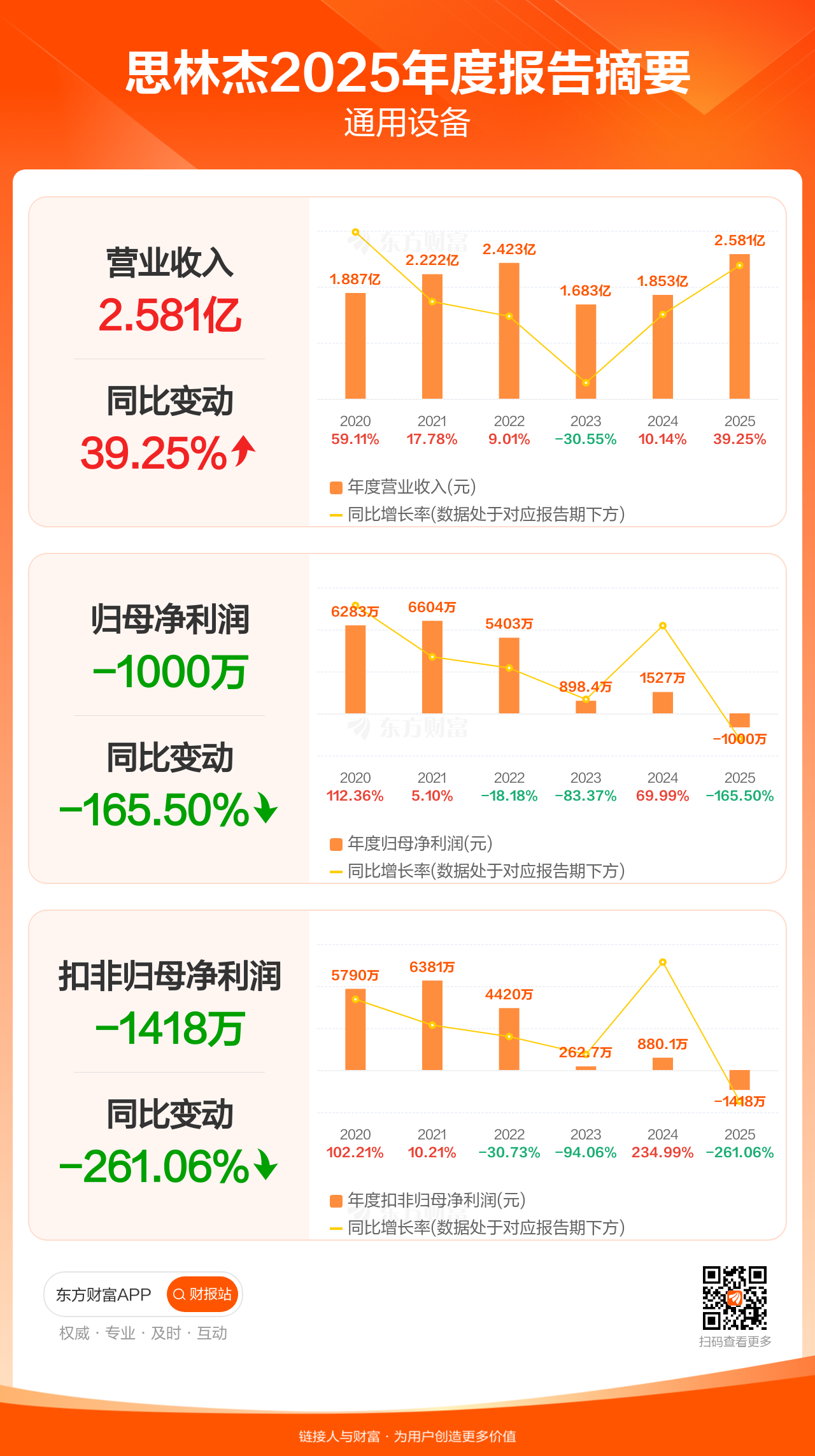 思林杰4月25日发布2025年年报显示,公司全年实现营业收入2.58亿元,同比增长39.25%;归母净利润-1000.34万元;扣非归母净利润-1417.54万元。