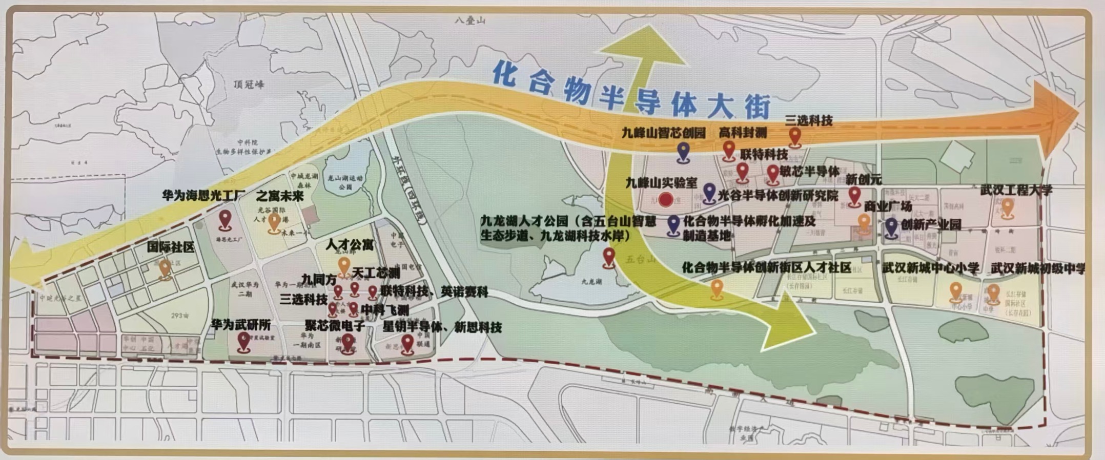 开幕式上,东湖高新区对外发布"光谷化合物半导体产业创新街区"规划方案,打造以九峰山实验室为"科技创新核",集产业发展融合区、产业发展赋能区、尖端人才聚集区为一体的"一核三区"格局,打通"研发-中试-量产"全链条,目标直指千亿级。