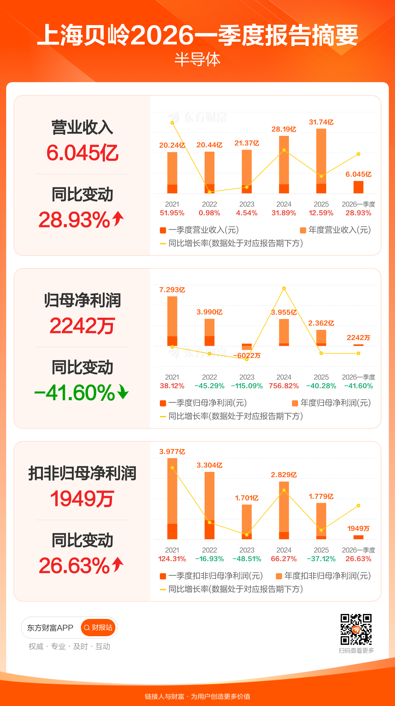 上海贝岭4月25日发布2026年一季报显示,公司一季度实现营业收入6.04亿元,同比增长28.93%;归母净利润2241.82万元,同比下滑41.60%;扣非归母净利润1949.03万元,同比增长26.63%。