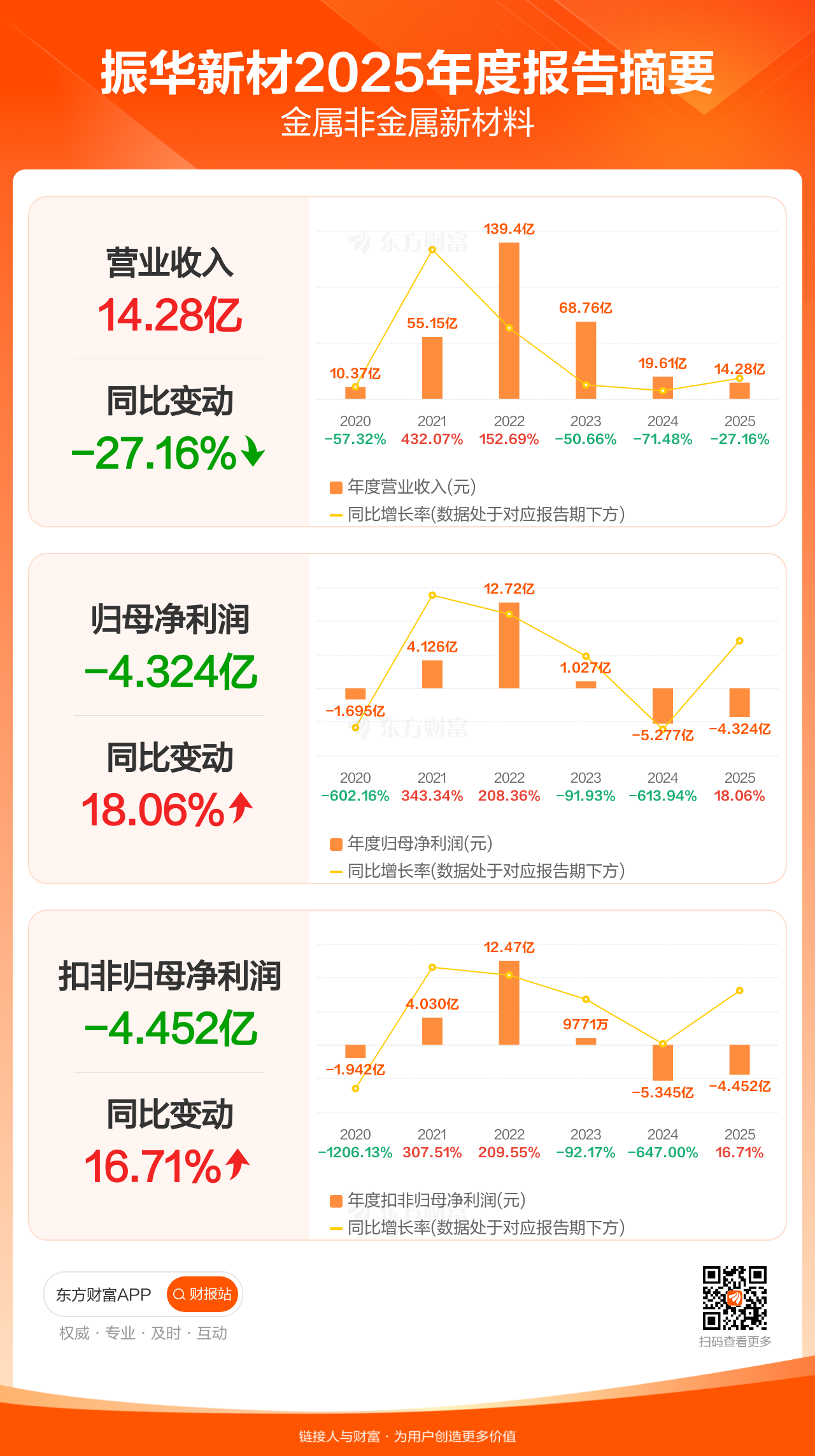 振华新材4月25日发布2025年年报显示,公司全年实现营业收入14.28亿元,同比下滑27.16%;归母净利润-4.32亿元;扣非归母净利润-4.45亿元。