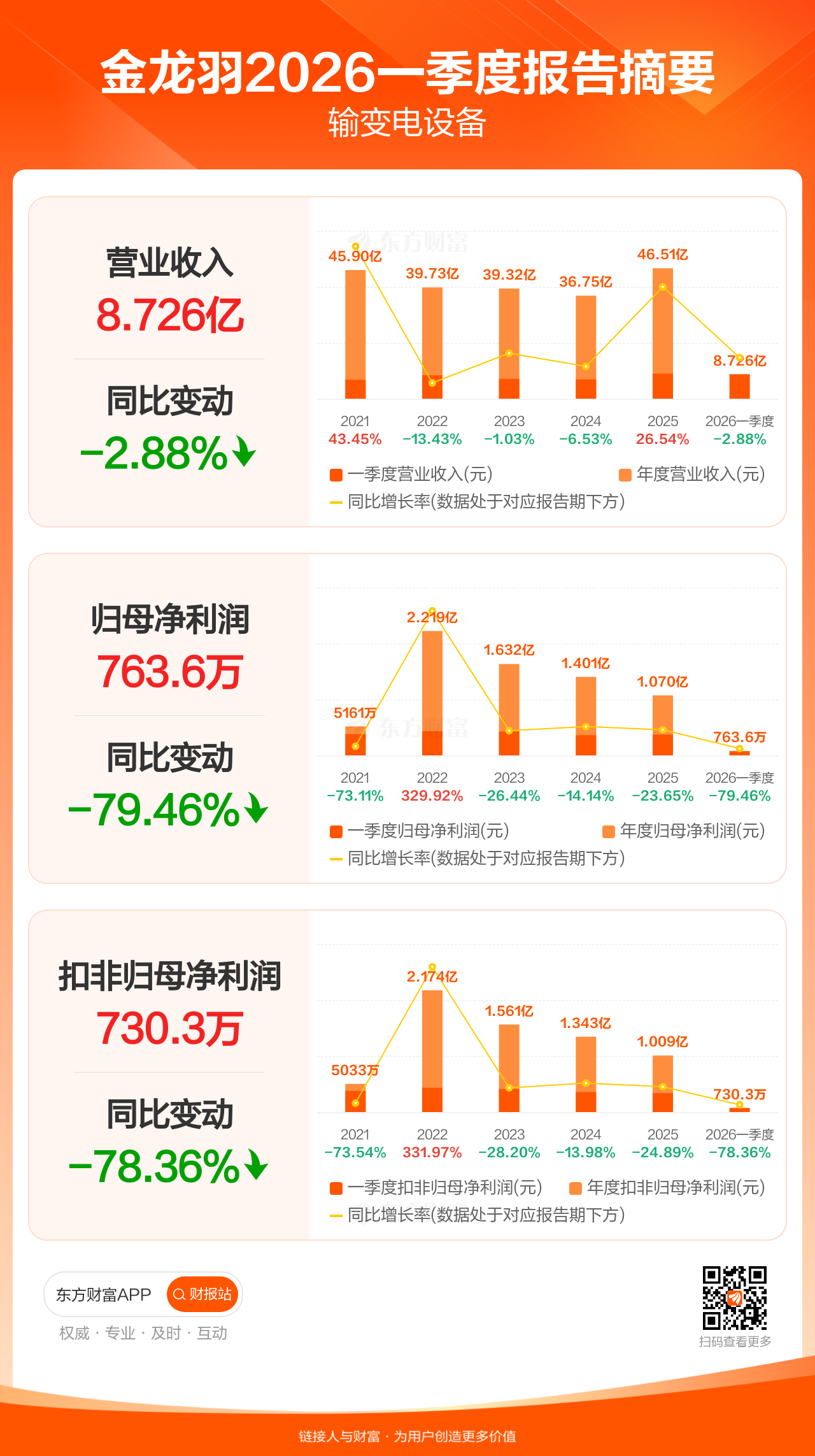 金龙羽4月25日发布2026年一季报显示,公司一季度实现营业收入8.73亿元,同比下滑2.88%;归母净利润763.59万元,同比下滑79.46%;扣非归母净利润730.25万元,同比下滑78.36%。