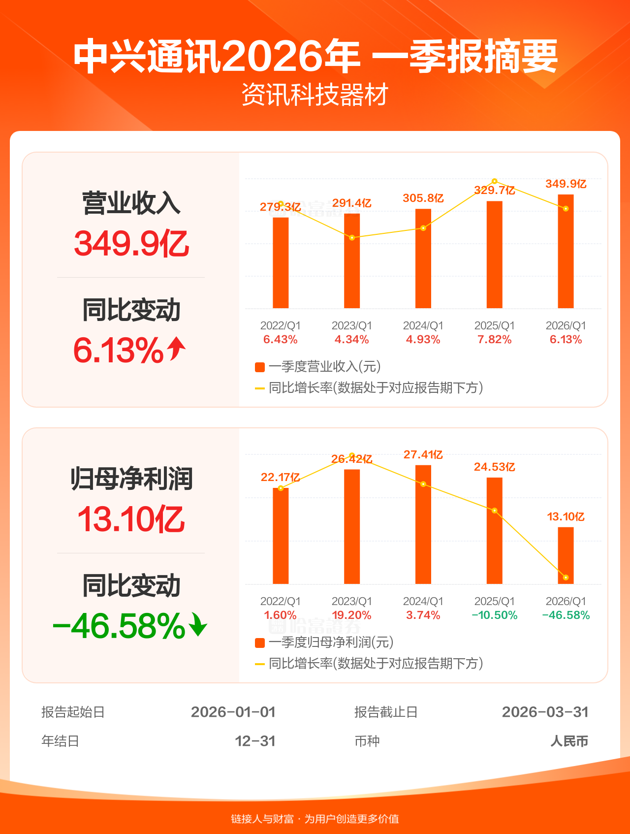 中兴通讯4月24日发布一季报业绩,截至2026年3月31日的3个月内,该公司营业收入349.88亿人民币,同比增长6.13%;公司权益持有人应占溢利(归母净利润)13.10亿人民币,同比减少46.58%。