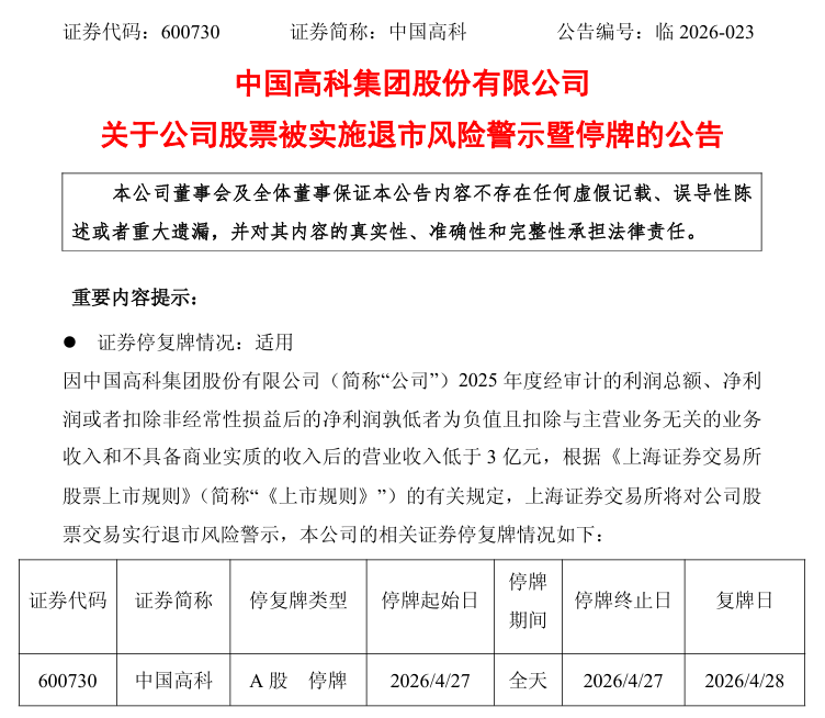 公司股票将于4月27日停牌1天,4月28日起被实施退市风险警示,A股简称由“中国高科”变更为“*ST高科”。实施后,股票将在风险警示板交易,日涨跌幅限制为5%。