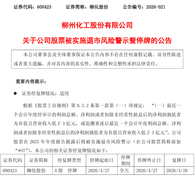 公司股票将于2026年4月27日停牌一天,自4月28日起被实施退市风险警示,证券简称变更为“*ST柳化”,日涨跌幅限制为5%。