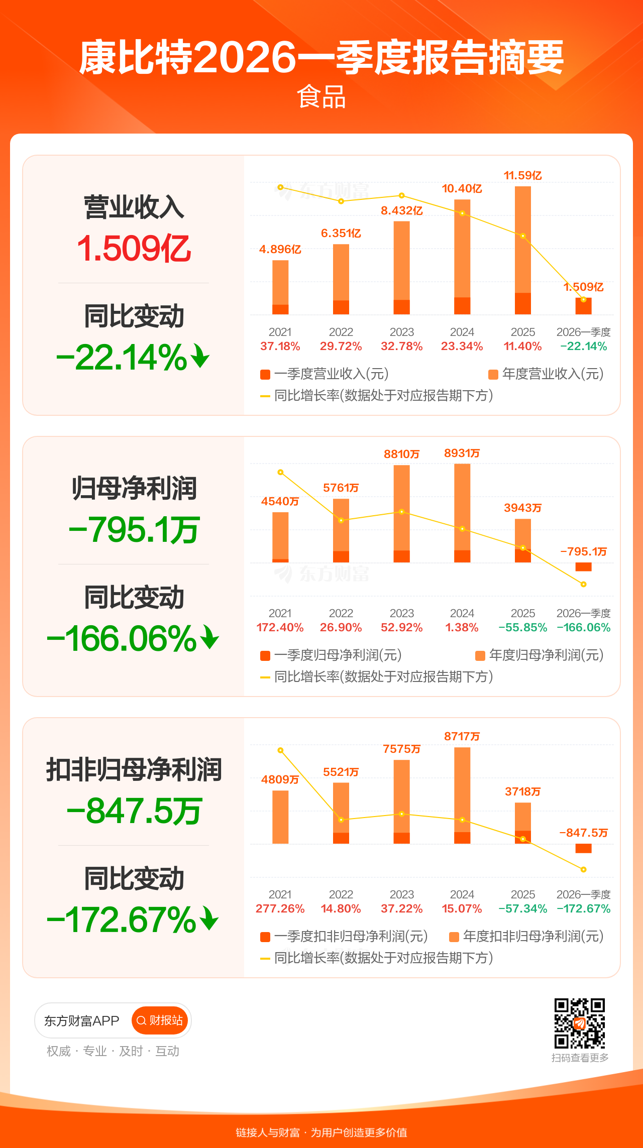 康比特4月24日发布2026年一季报显示,公司一季度实现营业收入1.51亿元,同比下滑22.14%;归母净利润-795.13万元;扣非归母净利润-847.54万元。