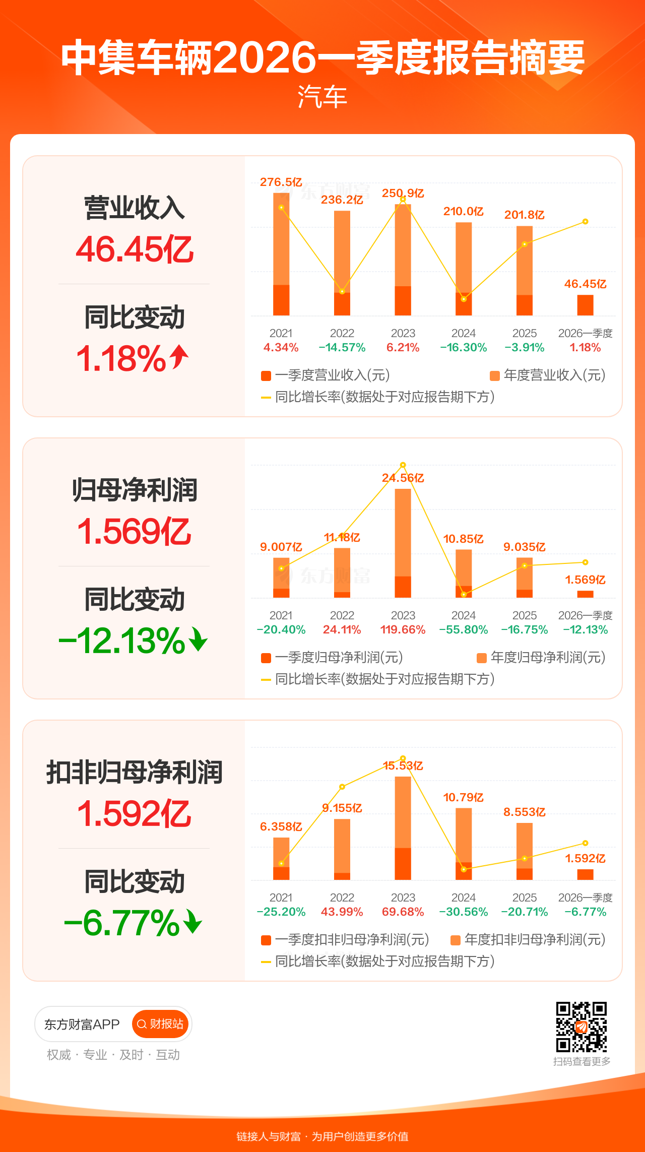 中集车辆4月25日发布2026年一季报显示,公司一季度实现营业收入46.45亿元,同比增长1.18%;归母净利润1.57亿元,同比下滑12.13%;扣非归母净利润1.59亿元,同比下滑6.77%。