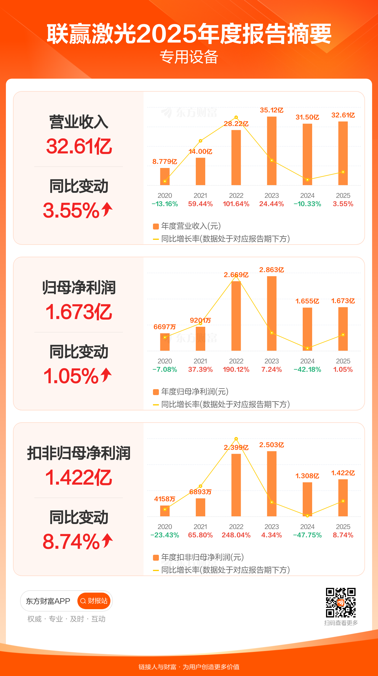 联赢激光4月25日发布2025年年报显示,公司全年实现营业收入32.61亿元,同比增长3.55%;归母净利润1.67亿元,同比增长1.05%;扣非归母净利润1.42亿元,同比增长8.74%。