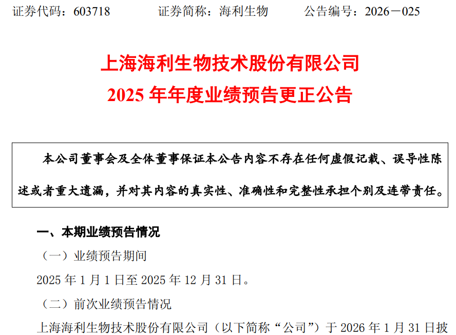4月24日晚间,海利生物(603718)发布2025年年度业绩预告更正公告,最新业绩预告显示公司2025年年度归母净利润将由原来的1,100万元到1,600万元转为约亏损3.14亿元。