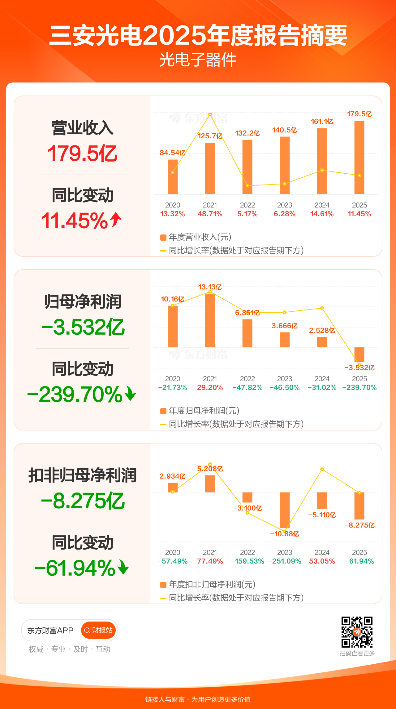 三安光电4月25日发布2025年年报显示,公司全年实现营业收入179.49亿元,同比增长11.45%;归母净利润-3.53亿元;扣非归母净利润-8.28亿元。