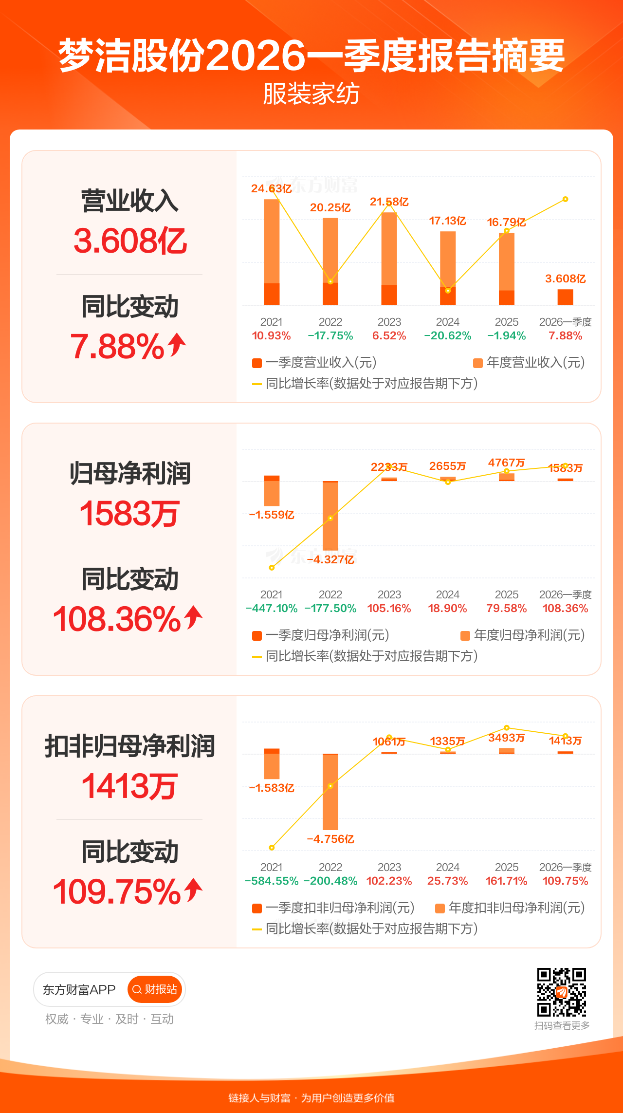 梦洁股份4月25日发布2026年一季报显示,公司一季度实现营业收入3.61亿元,同比增长7.88%;归母净利润1583.38万元,同比增长108.36%;扣非归母净利润1413.48万元,同比增长109.75%。