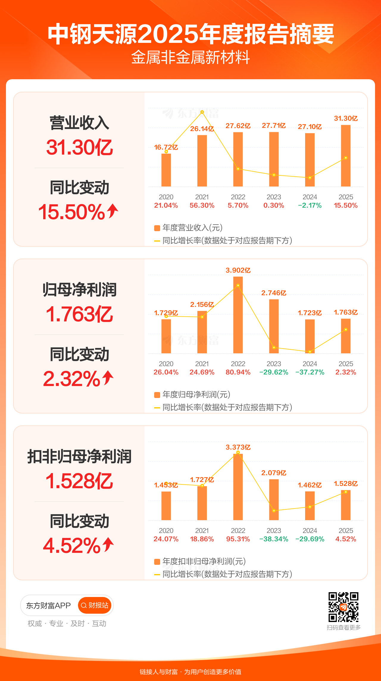 中钢天源4月25日发布2025年年报显示,公司全年实现营业收入31.30亿元,同比增长15.50%;归母净利润1.76亿元,同比增长2.32%;扣非归母净利润1.53亿元,同比增长4.52%。