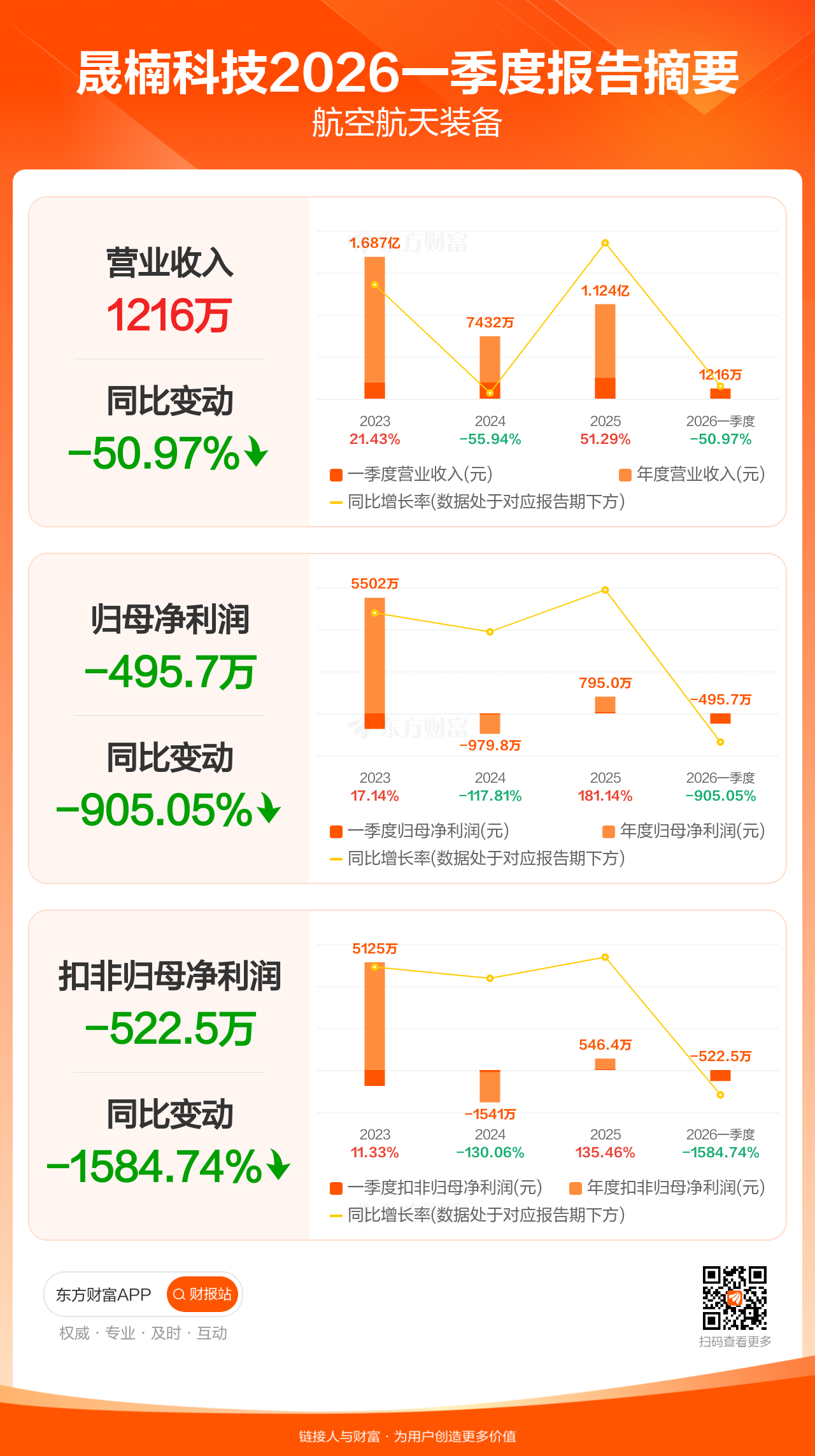 晟楠科技4月24日发布2026年一季报显示,公司一季度实现营业收入1215.74万元,同比下滑50.97%;归母净利润-495.70万元;扣非归母净利润-522.47万元。
