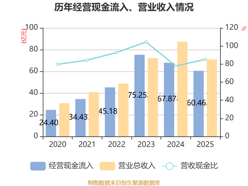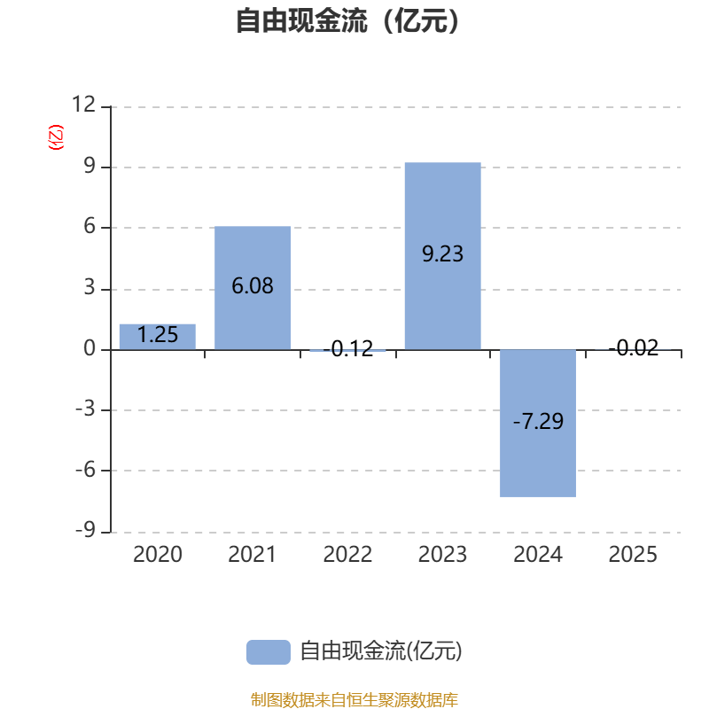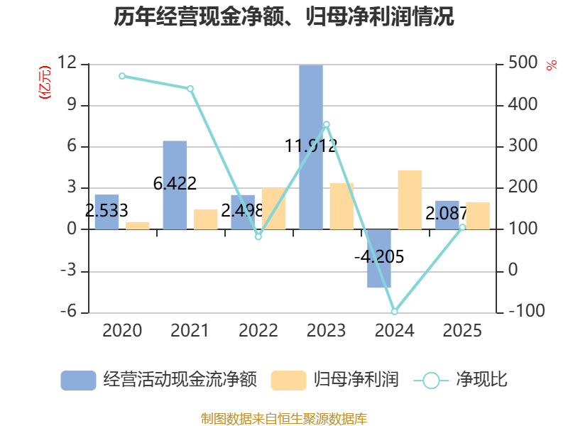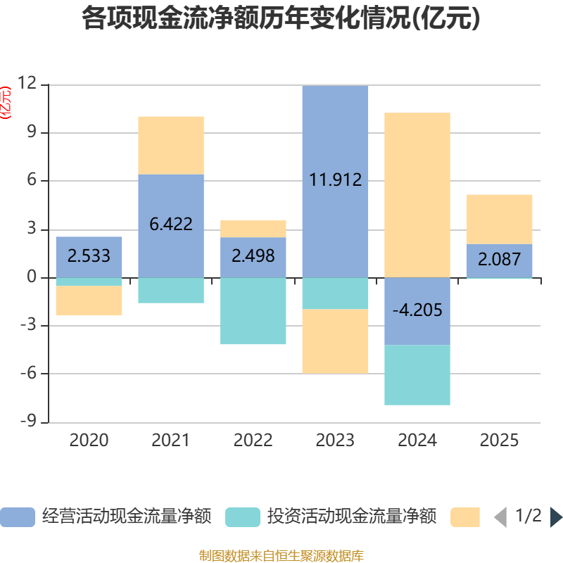 截至2025年,公司经营活动现金流净额为2.09亿元,同比增加6.29亿元;筹资活动现金流净额3.06亿元,同比减少7.19亿元;投资活动现金流净额-830.44万元,上年同期为-3.73亿元。