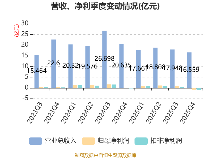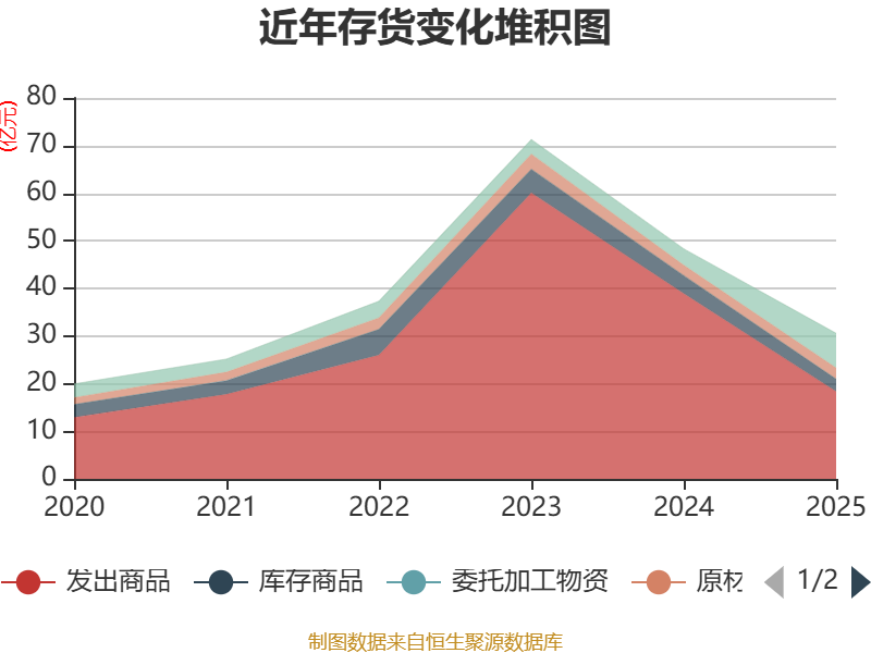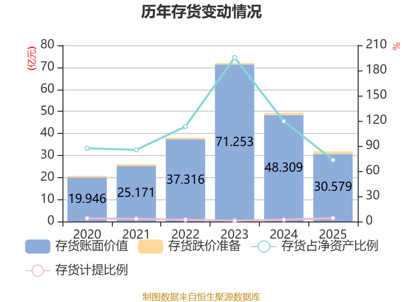 从存货变动来看,截至2025年末,公司存货账面价值为30.58亿元,占净资产的73.25%,较上年末减少17.73亿元。其中,存货跌价准备为1.27亿元,计提比例为3.98%。