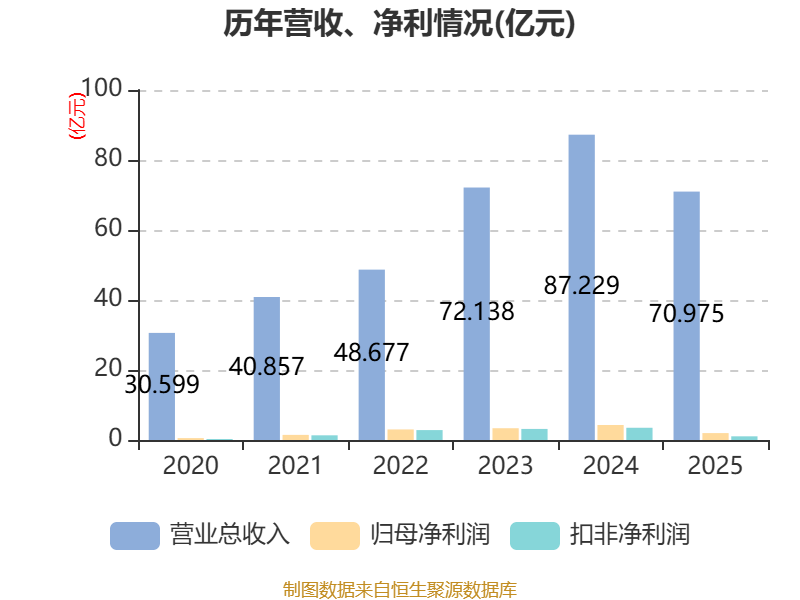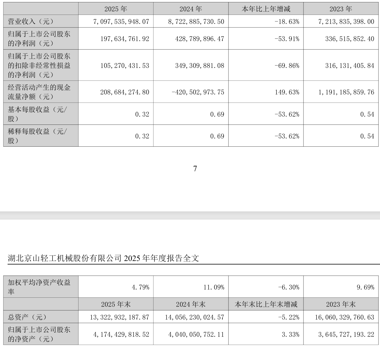 中证智能财讯 ST京机(000821)4月25日披露2025年年度报告。2025年,公司实现营业总收入70.98亿元,同比下降18.63%;归母净利润1.98亿元,同比下降53.91%;扣非净利润1.05亿元,同比下降69.86%;经营活动产生的现金流量净额为2.09亿元,上年同期为-4.21亿元;报告期内,ST京机基本每股收益为0.32元,加权平均净资产收益率为4.79%。公司2025年度分配预案为:拟向全体股东每10股派现0.33元(含税)。