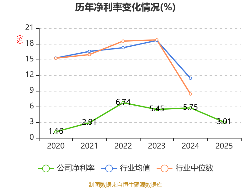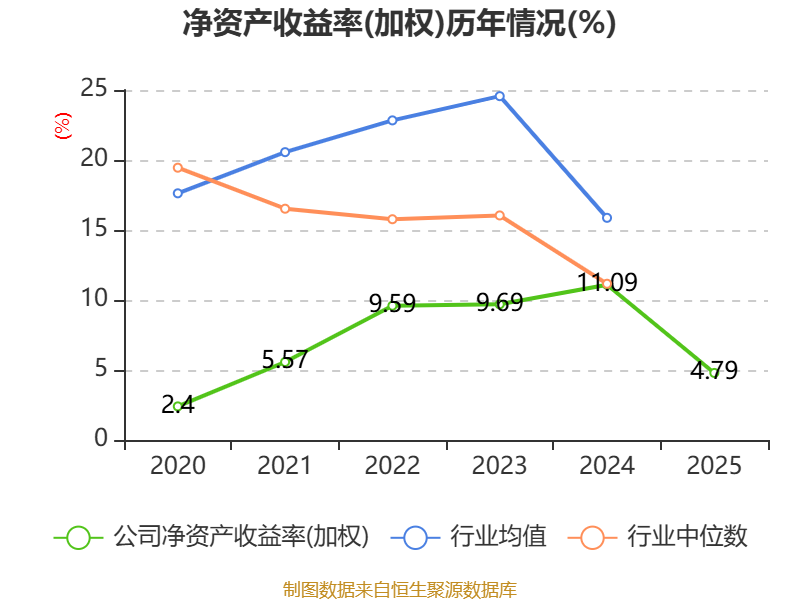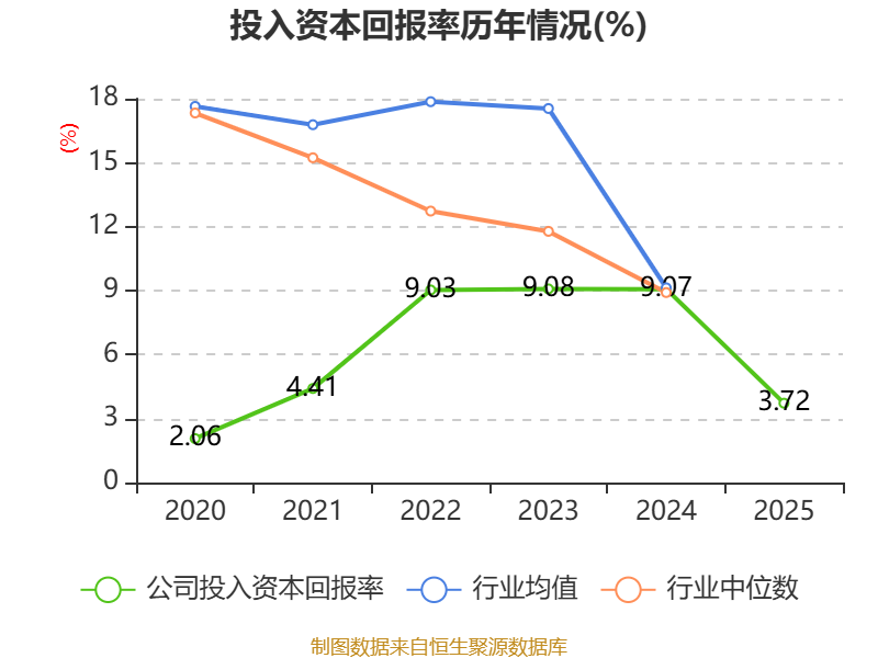 数据显示,2025年公司加权平均净资产收益率为4.79%,较上年同期下降6.3个百分点。公司2025年投入资本回报率为3.72%,较上年同期下降5.35个百分点。