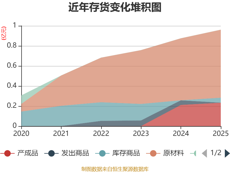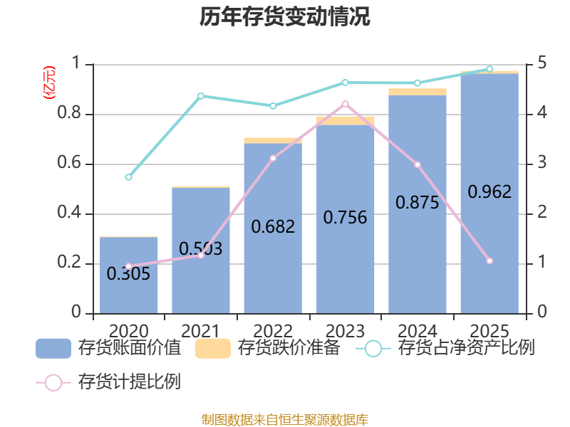 从存货变动来看,截至2025年末,公司存货账面价值为9618.36万元,占净资产的4.9%,较上年末增加871.41万元。其中,存货跌价准备为102.4万元,计提比例为1.05%。