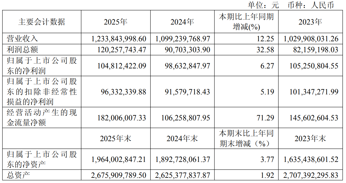 中证智能财讯江化微(603078)4月25日披露2025年年度报告。2025年,公司实现营业总收入12.34亿元,同比增长12.25%;归母净利润1.05亿元,同比增长6.27%;扣非净利润9633.23万元,同比增长5.19%;经营活动产生的现金流量净额为1.82亿元,同比增长71.29%;报告期内,江化微基本每股收益为0.2718元,加权平均净资产收益率为5.44%。公司2025年度分配预案为:拟向全体股东每10股派现0.6元(含税)。
