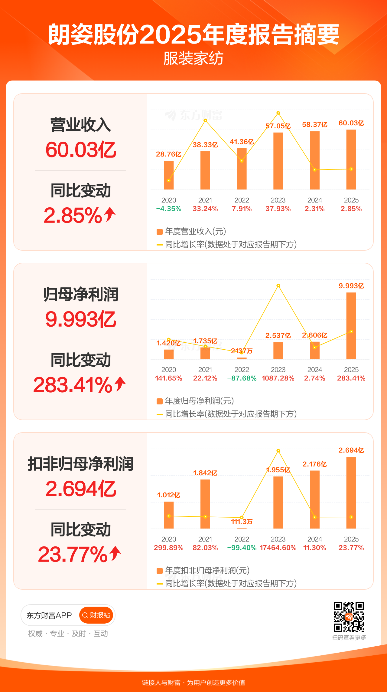 朗姿股份4月25日发布2025年年报显示,公司全年实现营业收入60.03亿元,同比增长2.85%;归母净利润9.99亿元,同比增长283.41%;扣非归母净利润2.69亿元,同比增长23.77%。