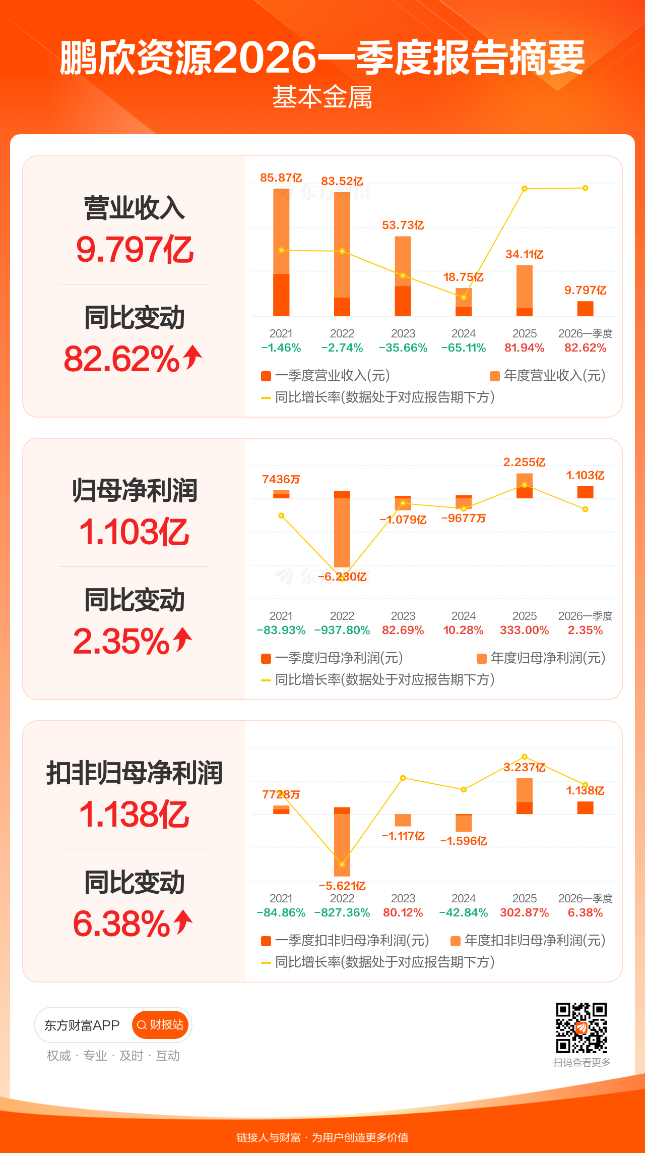 鹏欣资源4月25日发布2026年一季报显示,公司一季度实现营业收入9.80亿元,同比增长82.62%;归母净利润1.10亿元,同比增长2.35%;扣非归母净利润1.14亿元,同比增长6.38%。