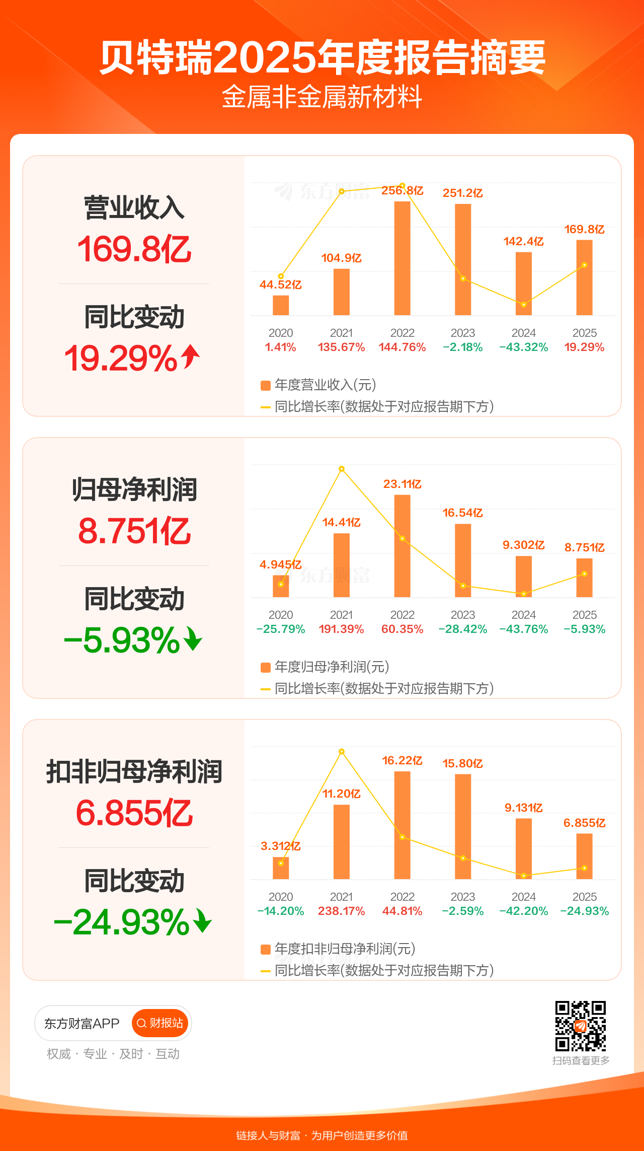 贝特瑞4月24日发布2025年年报显示,公司全年实现营业收入169.83亿元,同比增长19.29%;归母净利润8.75亿元,同比下滑5.93%;扣非归母净利润6.85亿元,同比下滑24.93%。