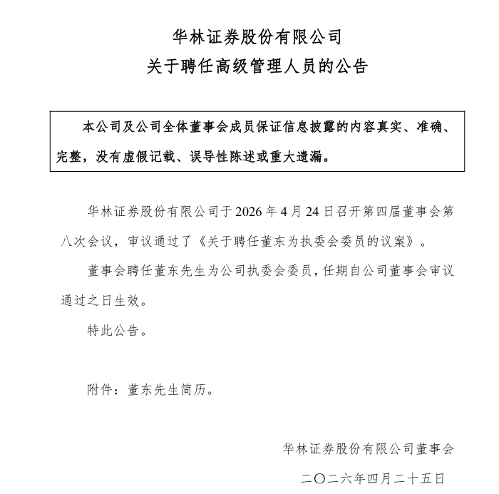 今日晚间,华林证券(002945.SZ)公告称,聘任董东为公司执委会委员。记者获悉,董东后续或担任公司副总裁。